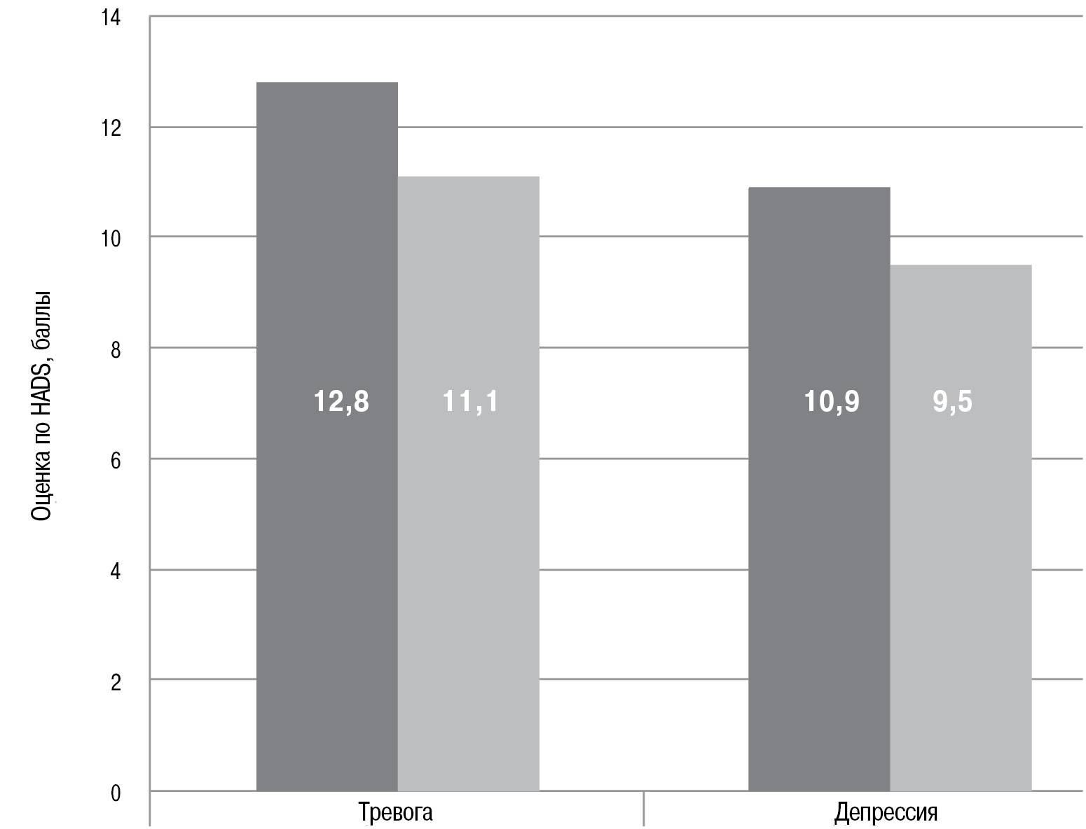 В нашей выборке пациенты в целом находились в состоянии умеренно-выраженной тревоги и депрессии. Эти показатели лишь незначительно снижались через 12 мес наблюдения.
