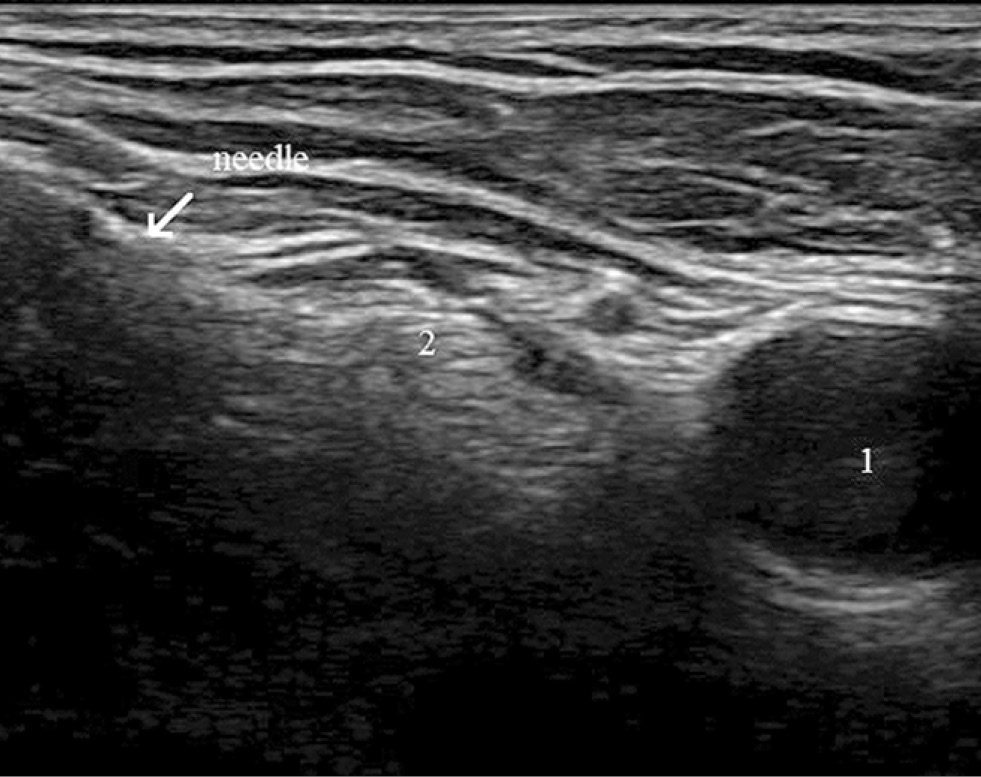 After the femoral nerve was identified laterally, an insulated block needle was inserted in-plane and advanced toward the lower portion of the femoral nerve, and 5 mL of ropivacaine 0.2% was injected (Fig. 2).
