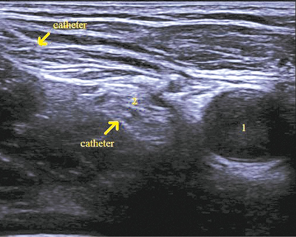 Using a catheter-through-needle technique, a perineural catheter was positioned at 2 cm from the femoral nerve (Fig. 3).