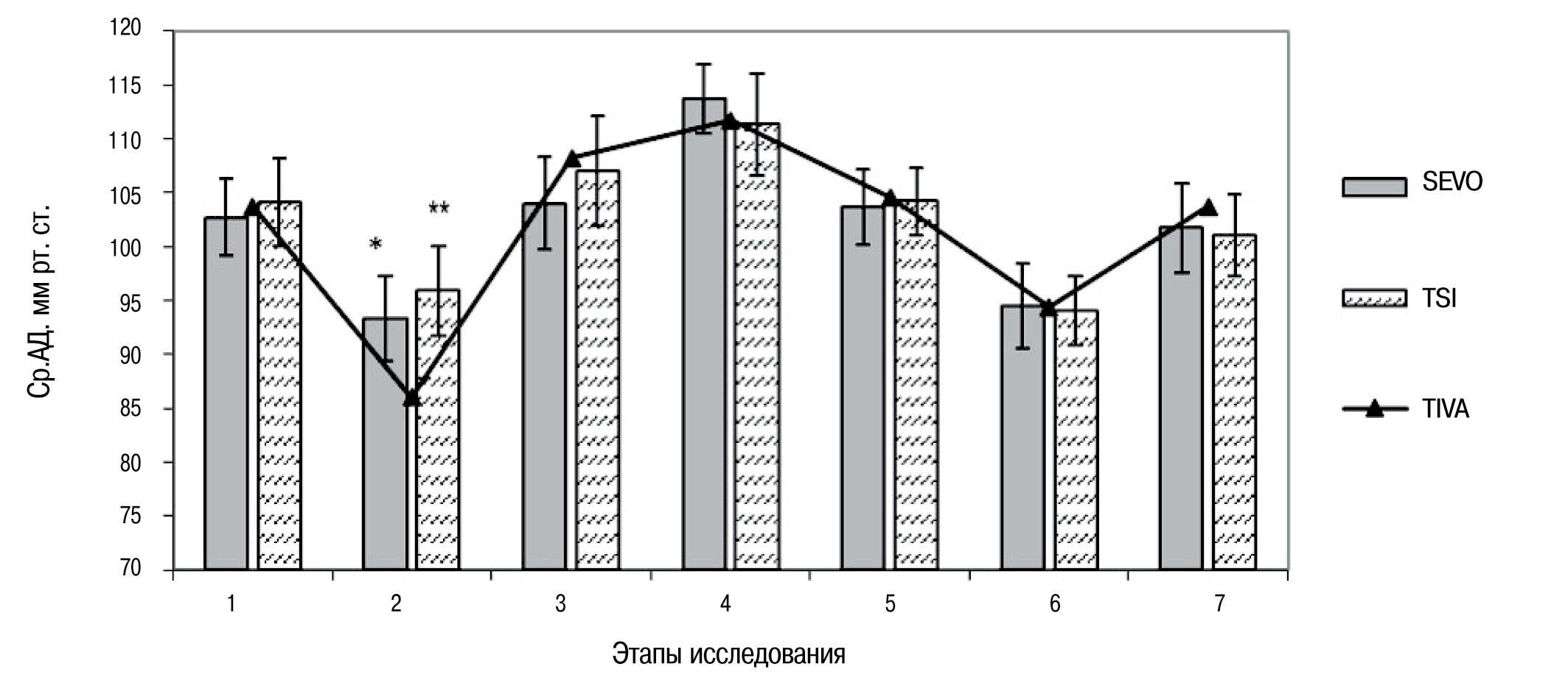 Примечания: 1) достоверные различия по сравнению с группой TIVA: * p < 0,05; ** p < 0,01; 2) этапы исследования: 1 – исходно, 2 – индукция, 3 – интубация, 4 – инсуффляция, 5 – базис, 6 – десуффляция, 7 – экстубация.