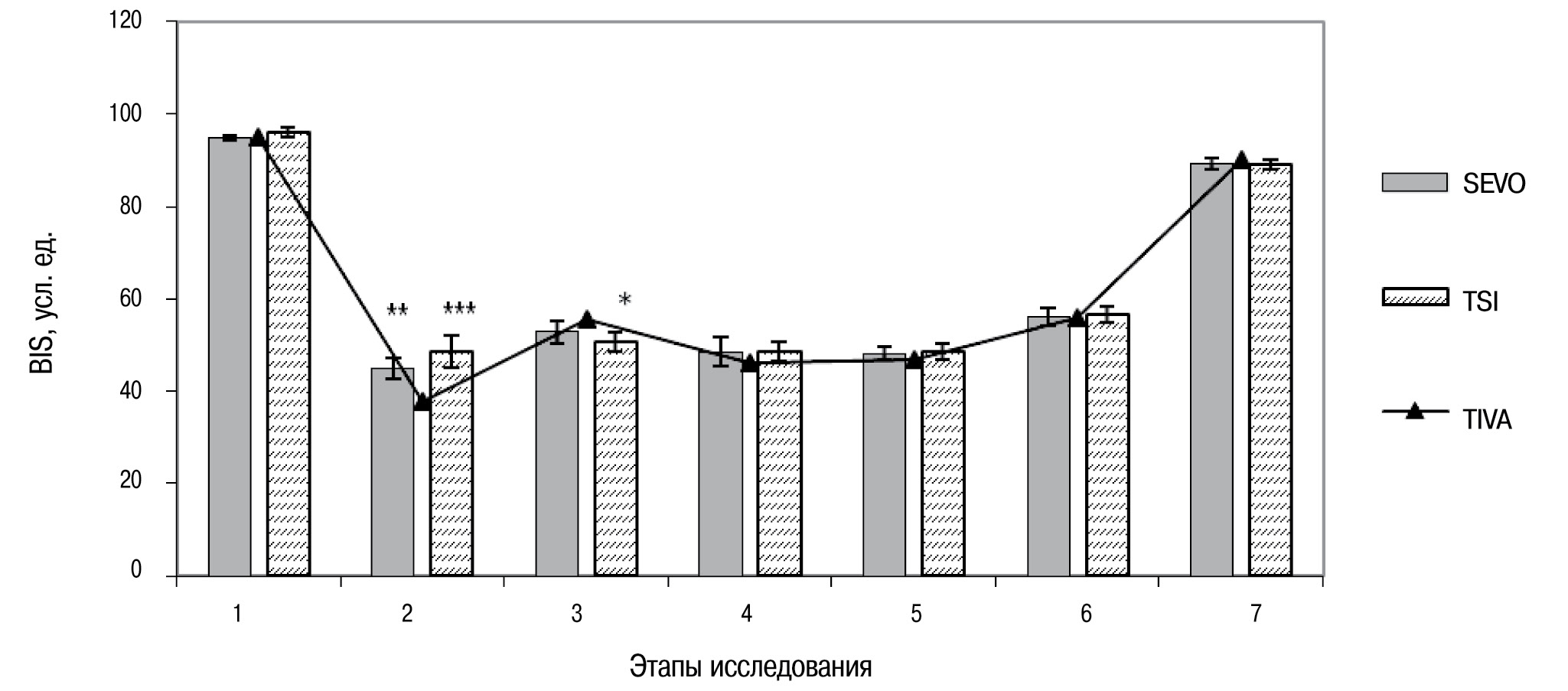 Примечания: 1) достоверные различия по сравнению с группой TIVA: *p < 0,05; **p < 0,01; *** p < 0,001; 2) этапы исследования: 1 – исходно, 2 – индукция, 3 – интубация, 4 – инсуффляция, 5 – базис, 6 – десуффляция, 7 – экстубация.