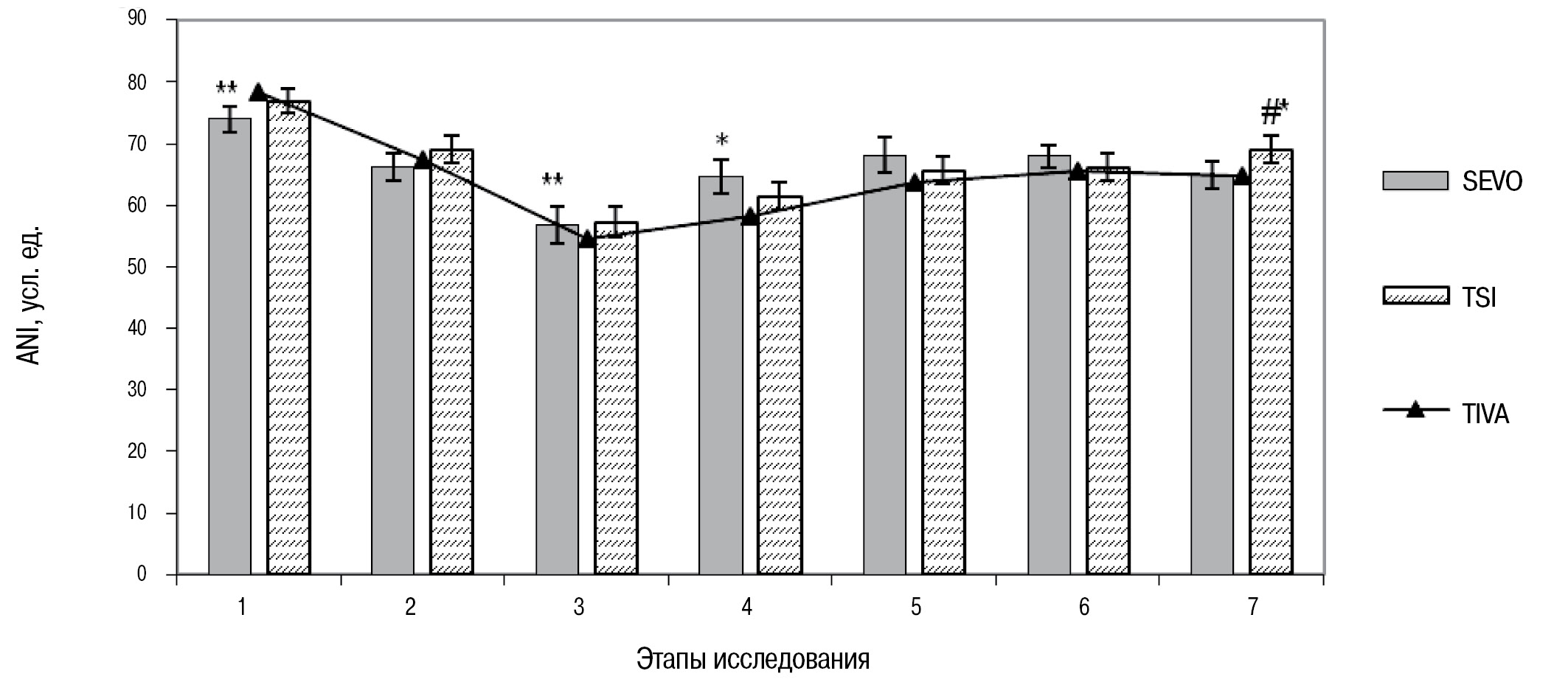 Примечания: 1) достоверные различия по сравнению с группой TIVA: *p < 0,05; ** p < 0,01; 2) достоверные различия по сравнению с группой SEVO: # p < 0,05; 3) этапы исследования: 1 – исходно, 2 – индукция, 3 – интубация, 4 – инсуффляция, 5 – базис, 6 – десуффляция, 7 – экстубация.