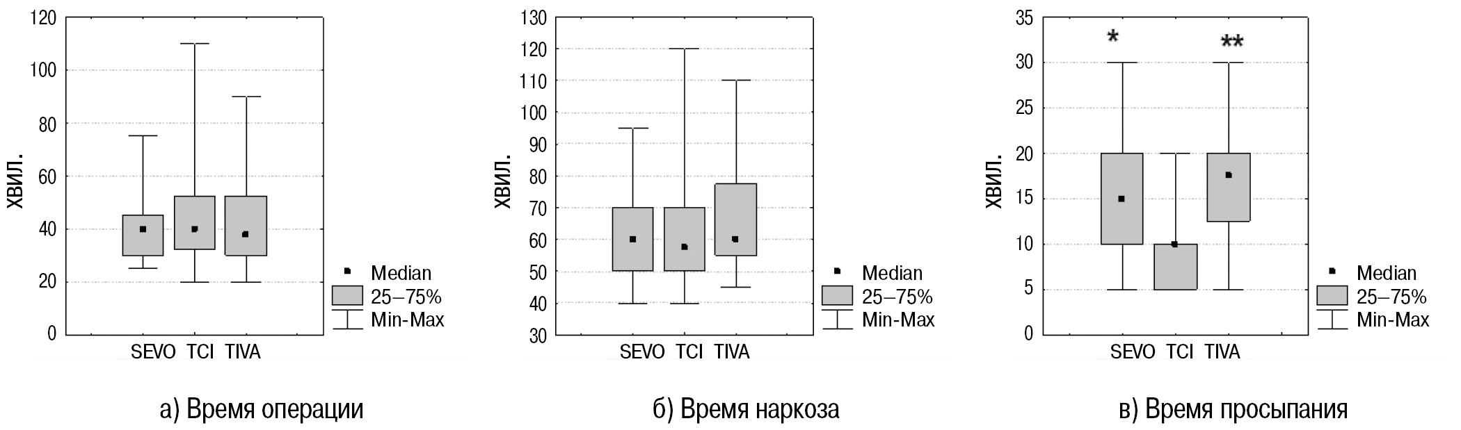 Время пробуждения было коротким в группе TCI и колебалось от 5 до 20 мин, медиана времени – 10,0 (5,0–10,0) мин. Что может свидетельствовать о лучшей управляемости среди сравниваемых анестезиологических обеспечений.