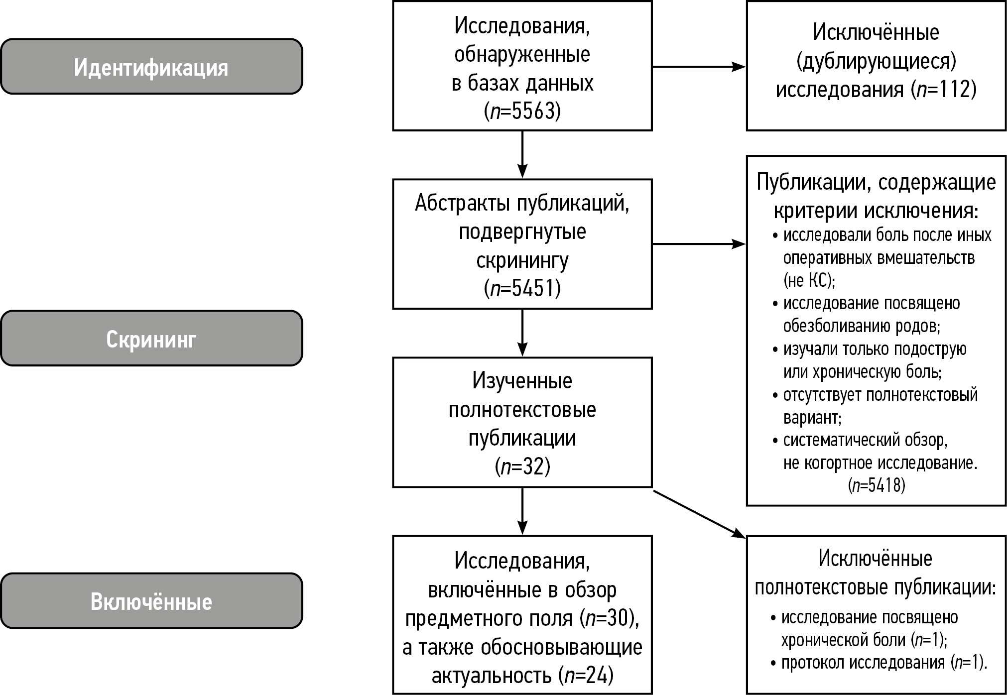 В соответствии с критериями PICOD (Population: postpartum women; Intervention: CS surgery; Comparison: surgical approach, anesthesia method, psychological status, pain threshold, genetic characteristics; Outcomes: pain intensity scores, analgesic requirements; (D) study Design: prospective/retrospective cohort studies — «Популяция, вмешательство, сравнение, исходы и дизайн исследования») для включения публикаций в обзор предметного поля были выбраны следующие критерии включения: