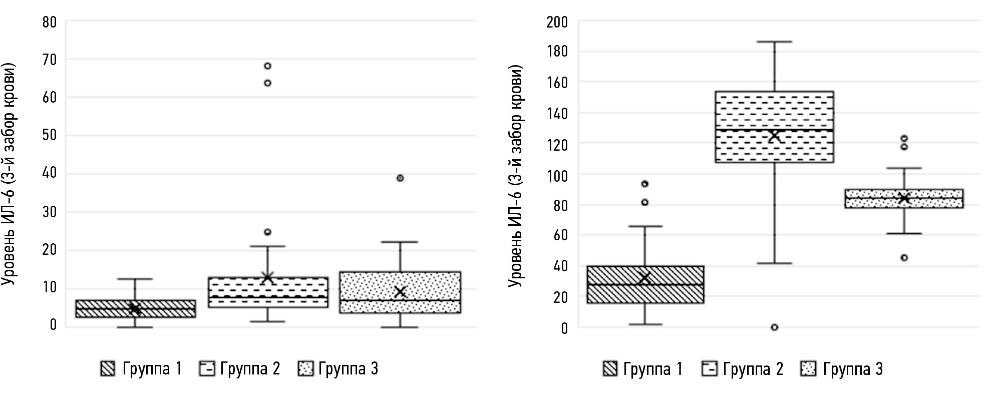 В рамках оценки содержания ИЛ-6 через 1 сут от момента окончания операции его уровень в 1-й группе был равен 32,6±22,44, во 2-й — 125,42±32,92, в 3-й — 84,5±14,59 пг/мл. При этом получены статистически значимые (H=65,603614, p <0,001) положительные различия в пользу 1-й группы (рис. 1).