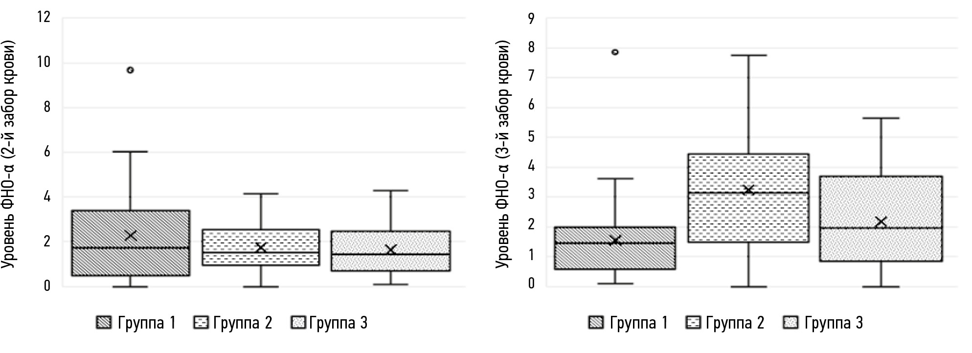 Непосредственно перед операцией содержание ФНО-α в сыворотке крови в 1-й группе составляло 2,3±1,5, во 2-й — 1,53±0,88, в 3-й — 1,84±1,19 пг/мл. На момент повторного взятия крови для анализа концентрация ФНО-α у пациентов 1-й группы была равна 2,28±2,15, 2-й — 1,75±1,16, 3-й группы — 1,64±1,03 пг/мл, что не имело статистически значимых различий (H=0,578241, p=0,748922). Спустя сутки после операции уровень ФНО-α в группах составлял 1,55±1,45, 3,2±2,05 и 2,17±1,57 пг/мл соответственно. Представленные данные отражают статистически значимую разницу в пользу 1-й группы (H=12,928289, p=0,001558; рис. 2).