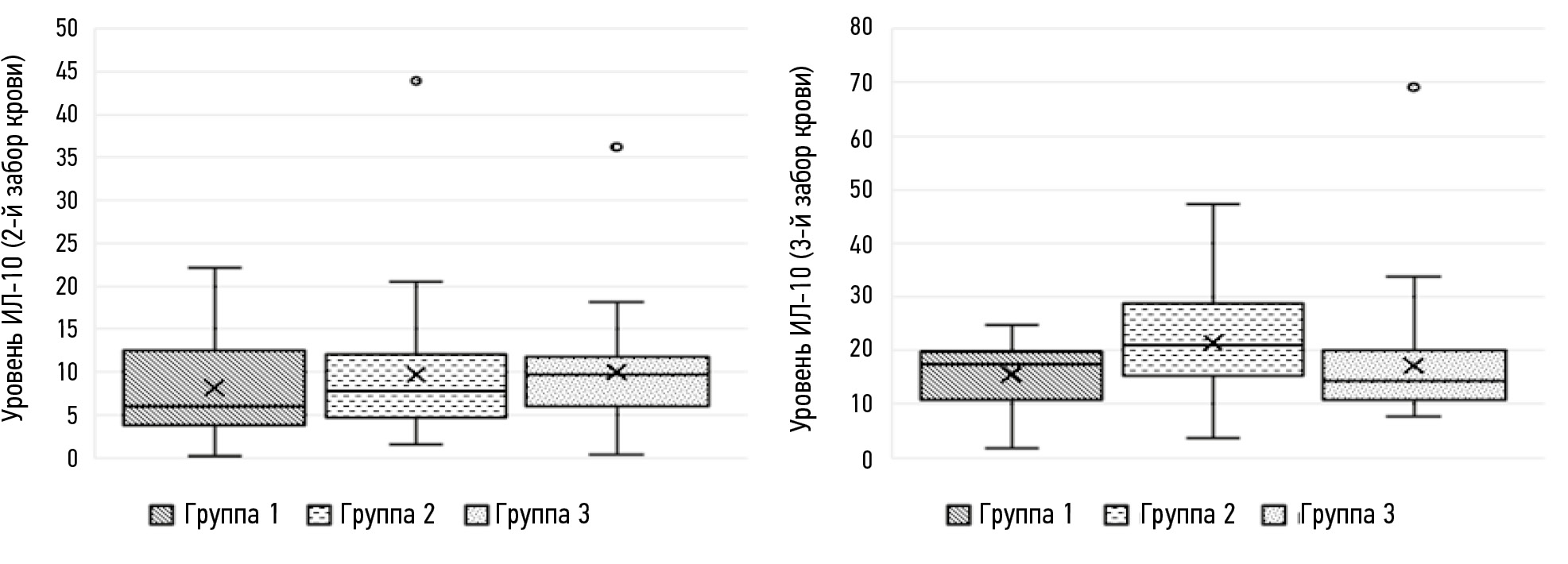 Исходно содержание ИЛ-10 в 1-й группе составляло 3,14±2,27, во 2-й — 2,6±1,56, в 3-й — 3,54±2,5 пг/мл, в конце операции — 8,13±5,5, 9,72±7,98 и 10,03±6,56 пг/мл соответственно, что не имело статистически значимых различий (H=1,325812, p=0,515352). На следующий день после операции концентрация ИЛ-10 в крови имела статистически значимые различия между группами (H=9,11072, p=0,010511) и составляла 15,53±5,6, 21,48±9,91 и 17,25±11,46 пг/мл соответственно (рис. 3). Такие результаты отражают преимущество применения безопиоидной анестезии и нейроаксиальной блокады по сравнению с группой фентанила в отношении снижения содержания ИЛ-10 через 1 сут после оперативного вмешательства.