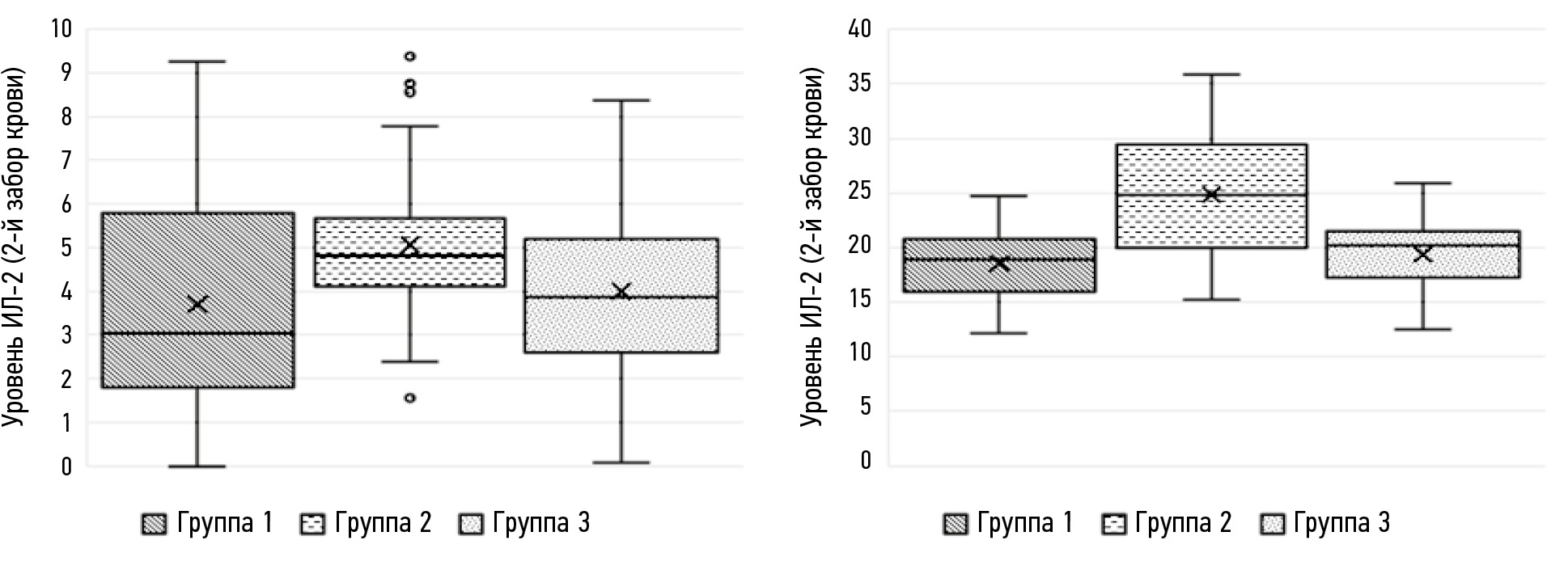 Уровень ИЛ-2 у пациентов 1-й группы до операции составлял 3,1±2, 2-й группы — 3,06±1,83, 3-й группы — 3,01±1,76 пг/мл. К концу операции отмечено повышение содержания ИЛ-2 в 1-й группе до 3,71±2,41, во 2-й — до 5,08±1,96, в 3-й группе — до 4±2,06 пг/мл, без статистически значимой разницы (H=5,185739, p=0,074805). Однако на момент взятия крови в 3-й контрольной точке лабораторные показатели в 1-й группе составляли 18,57±3,59, во 2-й — 24,89±5,04, в 3-й — 19,42±3,22 пг/мл, что оказалось статистически значимым (H=23,420171, p=0,000008; рис. 4).