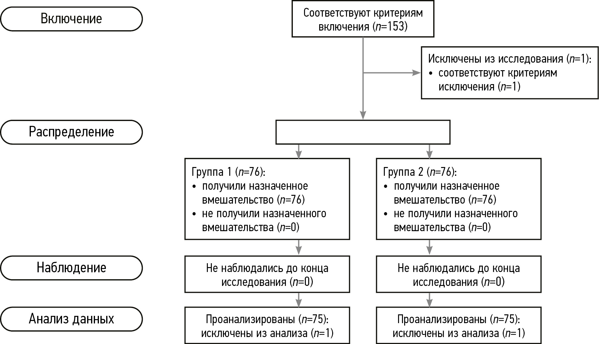 Как указано выше, отбор для участия в исследовании прошли 153 пациента, 1 из которых был исключен на этапе распределения, а ещё 2 выбыли на этапе анализа данных согласно критериям исключения. 150 человек распределили на 2 группы методом простой рандомизации.