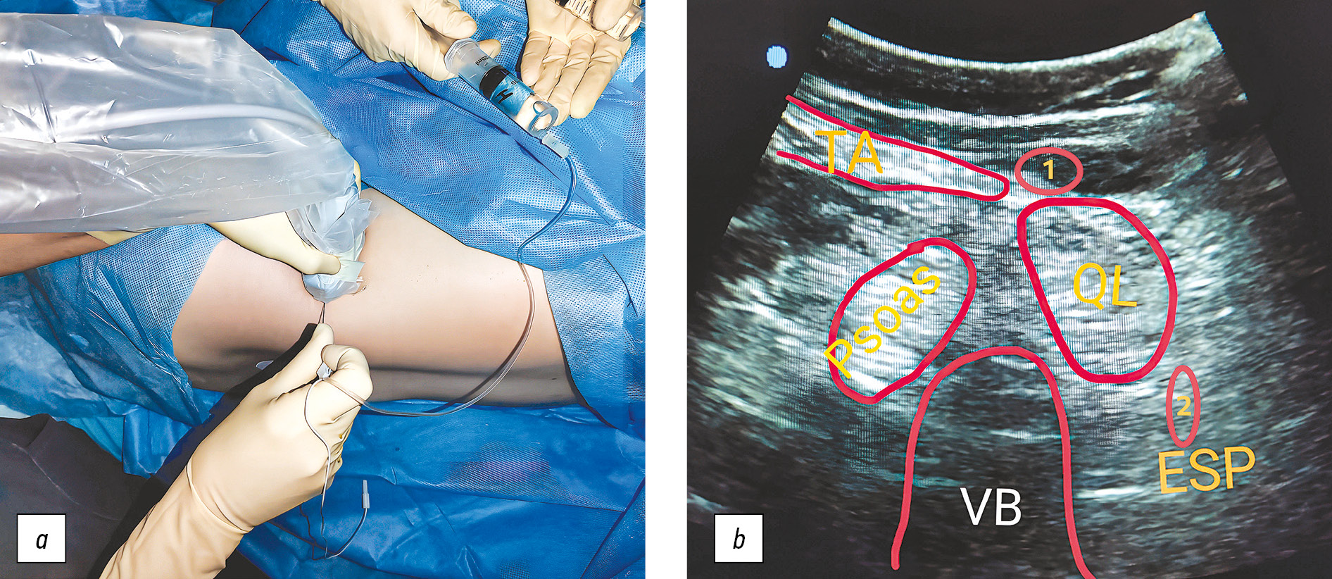 Рис. 2. Техника выполнения комбинированной блокады квадратной мышцы поясницы (фото из личного архива А.А. Ежевской). a — положение датчика и иглы на теле пациента, b — ультразвуковое изображение квадратной мышцы поясницы и областей введения местного анестетика, VB — поперечный отросток позвонка LIII, Psoas — большая поясничная мышца, QL — квадратная мышца поясницы, ESP — мышца, выпрямляющая позвоночник, TA — поперечная мышца живота, 1 — область введения местного анестетика при БКМП-1, 2 — область введения местного анестетика при БКМП-2.
