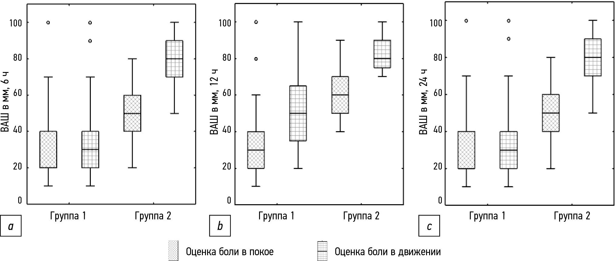 Первичным результатом считали оценку интенсивности послеоперационной боли в покое и при движении через 6, 12 и 24 ч после оперативного вмешательства с использованием ВАШ. Также фиксировали расстояние, пройденное пациентами через 12 и 24 ч после вмешательства.