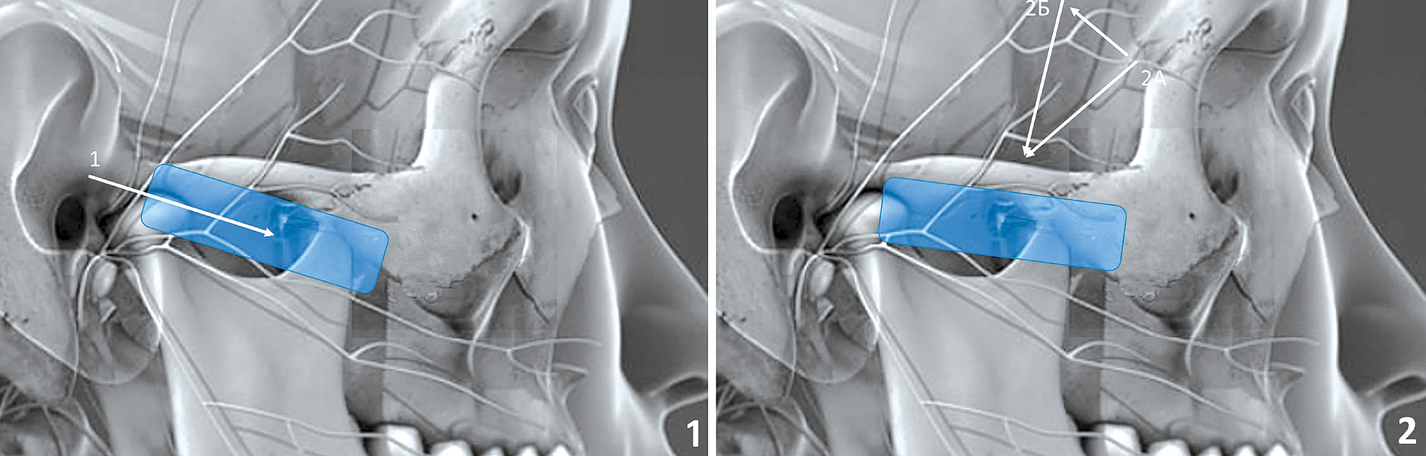 Fig. 1. The location of the sensor and the position of the needle when performing the ultrasound-navugated PPB (original drawing). Blue rectangle — sensor position, 1 — posterior-anterior infrazygomatic approach, 2 — supra-zygomatic approach, A, Б — needle position change).