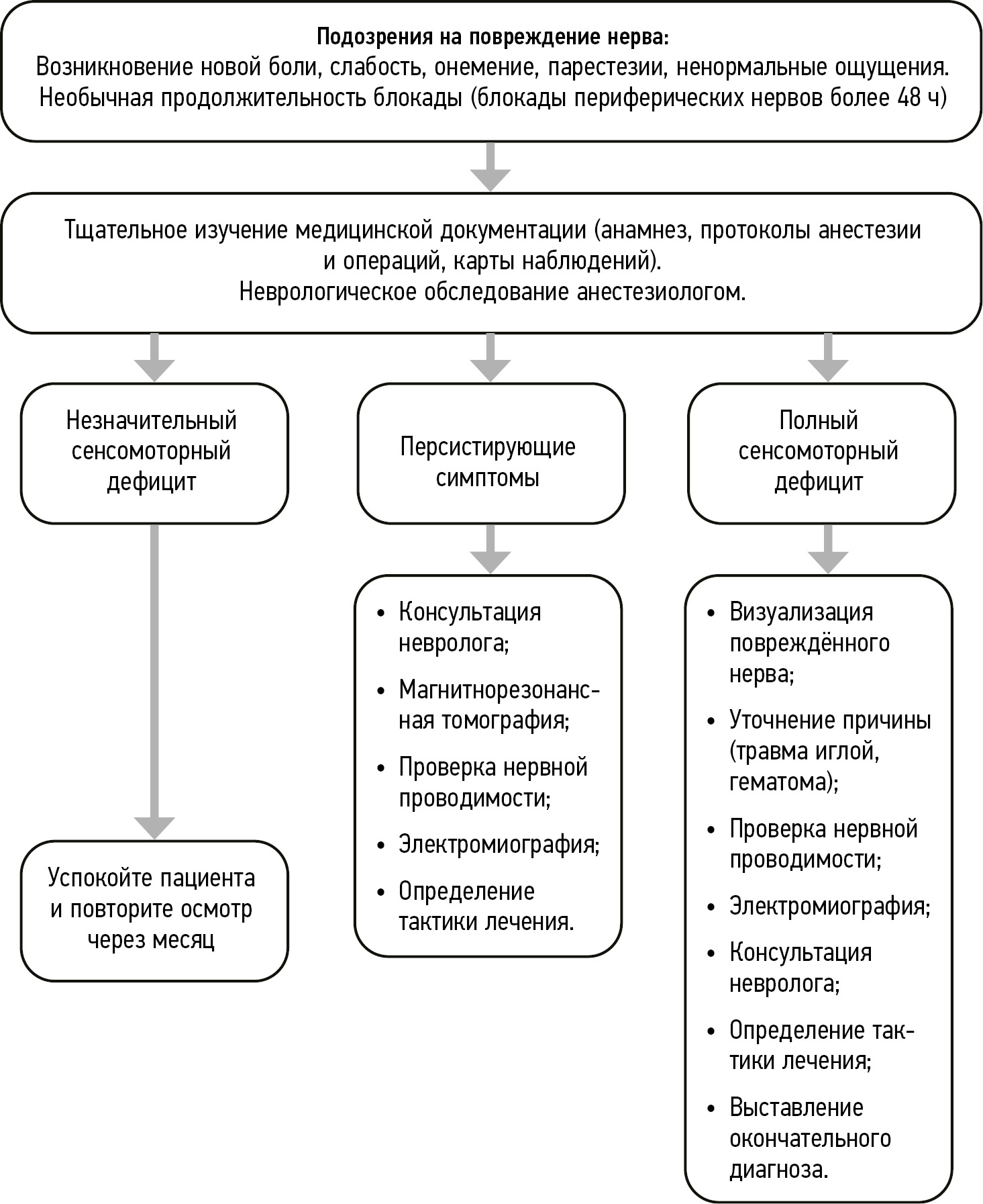 Алгоритм наблюдения за пациентом с подозрением на повреждение нерва после регионарной анестезии представлен на рис. 1.