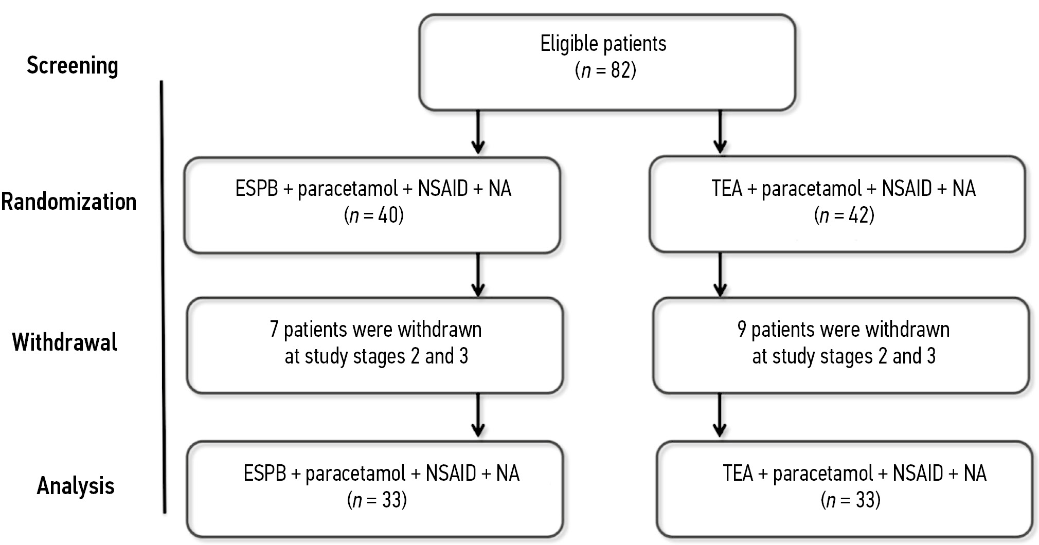 Fig. 1. Study flow-chart. ESPB, erector spinae plane block; TEA, thoracic epidural analgesia; NSAID, non-steroidal anti-inflammatory drug; NA, narcotic analgesic.