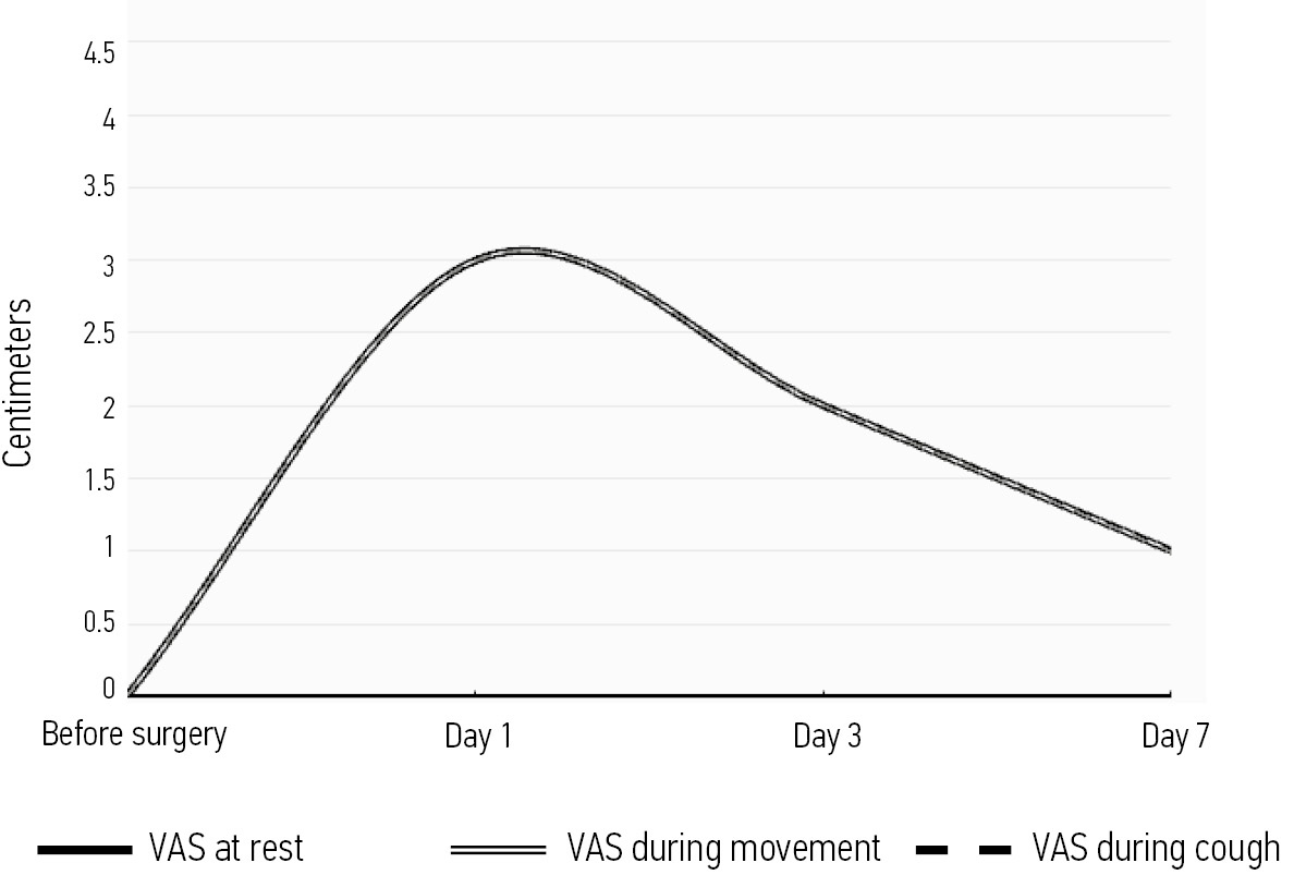 Pain intensity was assessed using the visual analog scale (VAS) at rest, during movement, and during cough at 24 hours, 72 hours, and day 7 after surgery. Blood pressure, heart rate, and respiration rate were also measured at these time points. Twelve months later, a telephone survey was conducted, and two questions were asked: 1) “Do you have pain in the area of your postoperative wound?”; 2) “Can you say that postoperative pain interferes with your quality of life?”