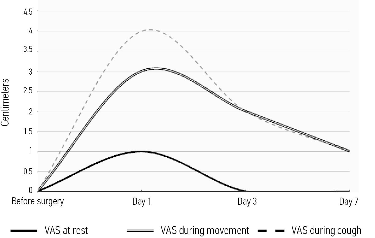 RESULTS: On postoperative day 1, VAS scores for pain during movement and coughing were significantly lower in the study group (30 mm) compared to the control group (30 mm during movement and 40 mm during coughing; p=0.0004). No significant between-group differences in pain intensity during movement and coughing were found at 72 h or day 7 after operation. No significant between-group differences in inflammatory markers were observed at any time point. VC values decreased to 2.9 L on day 1 in both groups (p <0.01). By postoperative day 7, VC values returned to baseline in both groups: 3.6 L in the study group and 3.6 L in the control group (p <0.01).