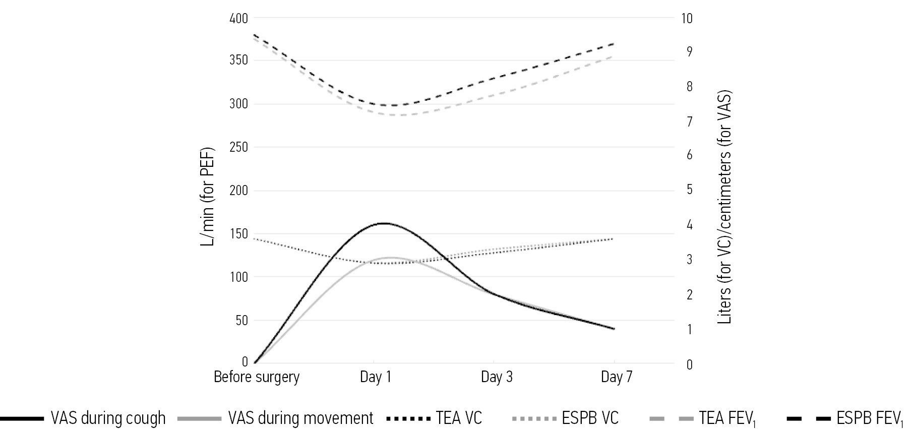 Patients assessed the intensity of their pain using VAS at rest, during movement (sitting up in bed), and during cough. VC was measured using a dry portable spirometer. PEF was measured using a Philips Personal Best portable automatic peak flow meter (USA).