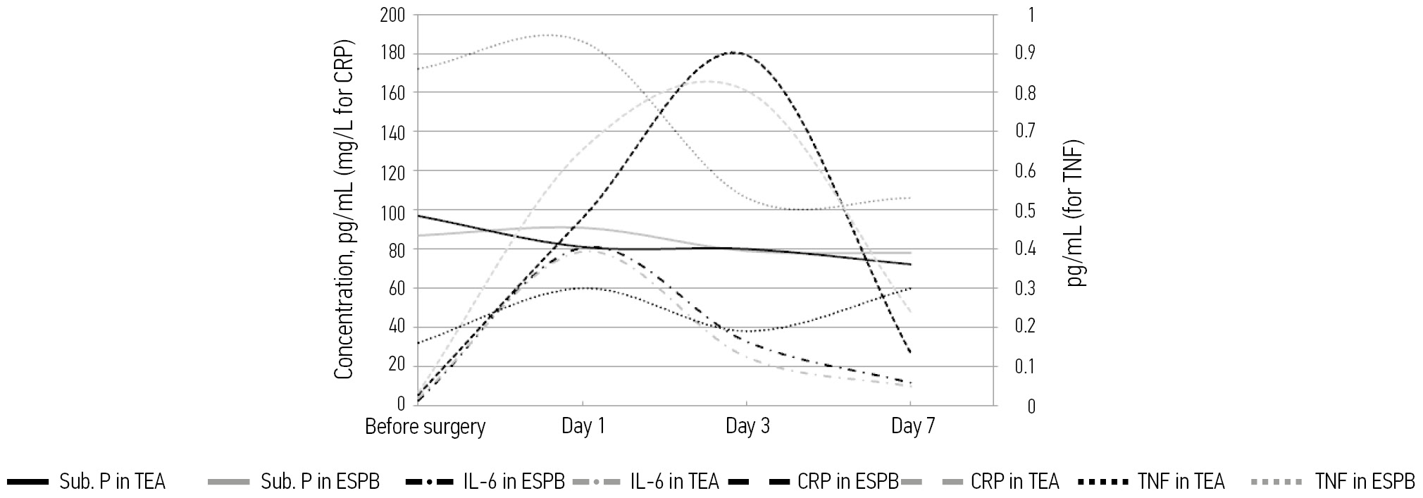 Pulmonary function tests (VC and PEF) were evaluated at control time points. Laboratory markers (CRP, IL-6, TNF-α, substance P) were evaluated as indirect indicators of postoperative analgesia.
