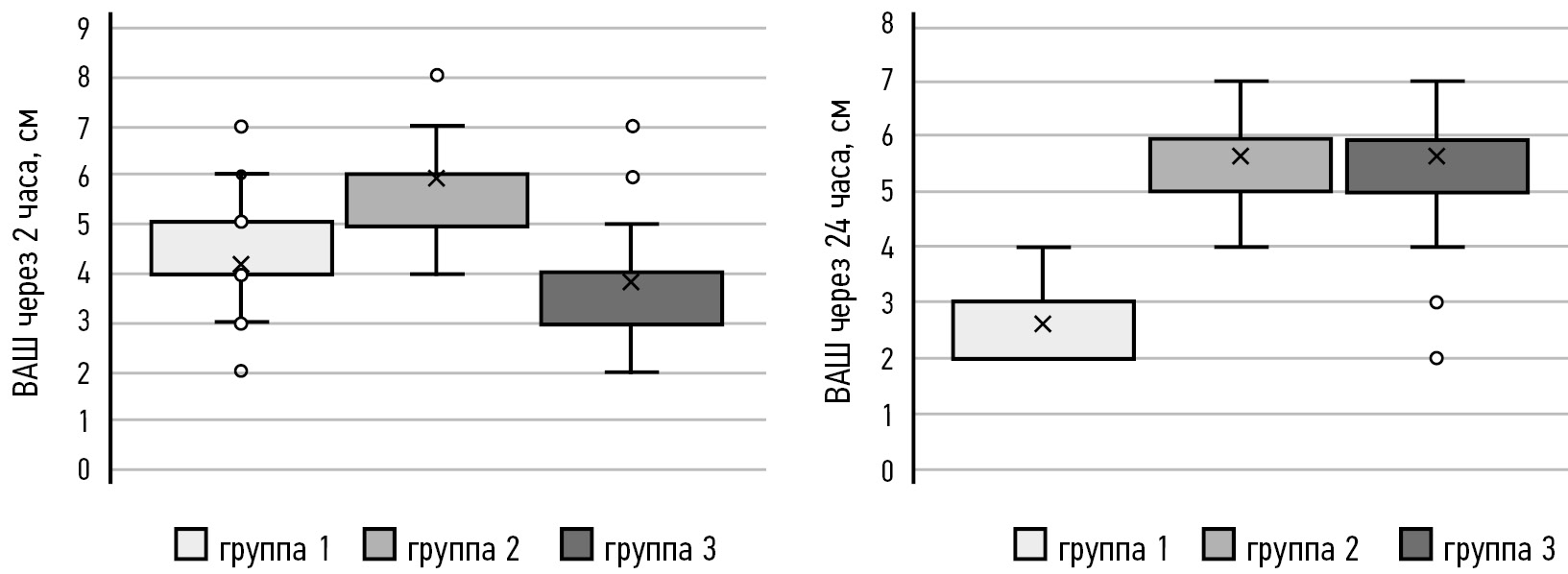 К основному исходу исследования были отнесены оценка выраженности боли по визуальной аналоговой шкале (ВАШ) через 2 часа и через сутки после оперативного вмешательства, а также потребность в опиоидных анальгетиках (тримеперидин и трамадол) в первые 24 часа после операции. Если болевой синдром соответствовал ≤5 см по ВАШ, назначали трамадол, если интенсивность болевого синдрома оказывалась >5 см по ВАШ, использовали тримеперидин.