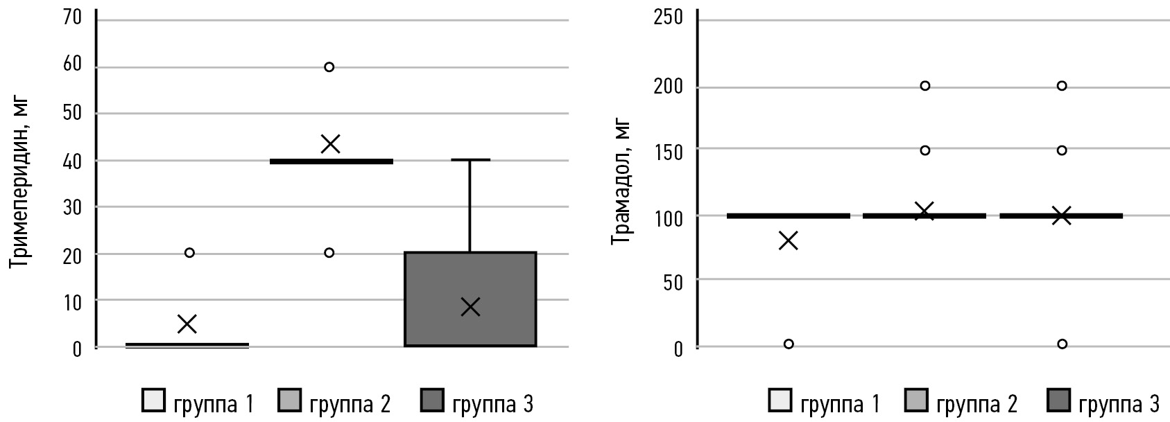 На следующем этапе нами была произведена оценка потребности в опиоидах после операции. В группе субарахноидального введения морфина использовался только трамадол в суточной дозе 100 [100–100] мг. Во 2-й группе использовался только тримеперидин, в суточной дозе 40 [40–40] мг. В 3-й группе использовался преимущественно трамадол в дозе 100 [100–100] мг, однако 36 пациентам (42,4%) дополнительно потребовалось введение тримеперидина в дозе 20 мг. Потребность в опиоидных анальгетиках в 1-е послеоперационные сутки представлена на рис. 2.