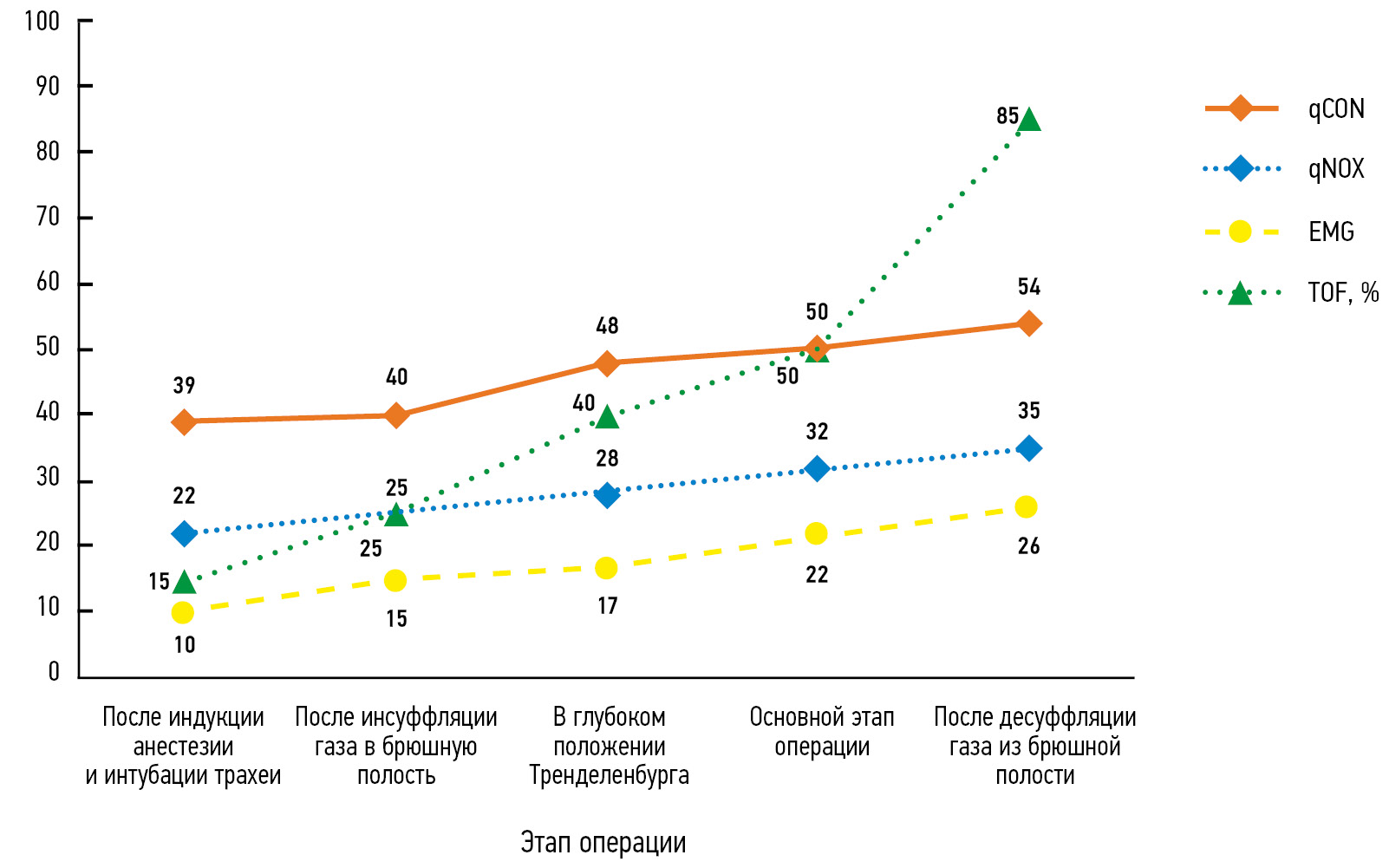 Рис. 1. Динамика показателей глубины анестезии и миоплегии на этапах операции: qCON — индекс сознания; qNOX — индекс ноцицепции; EMG — показатель электромиографии; TOF — показатель нервно-мышечной проводимости. Значения индексов qCon, qNOX и EMG представлены по безразмерной шкале от 0 до 99, отношение TOF (соотношение силы четвёртого сокращения к первому) — в %.