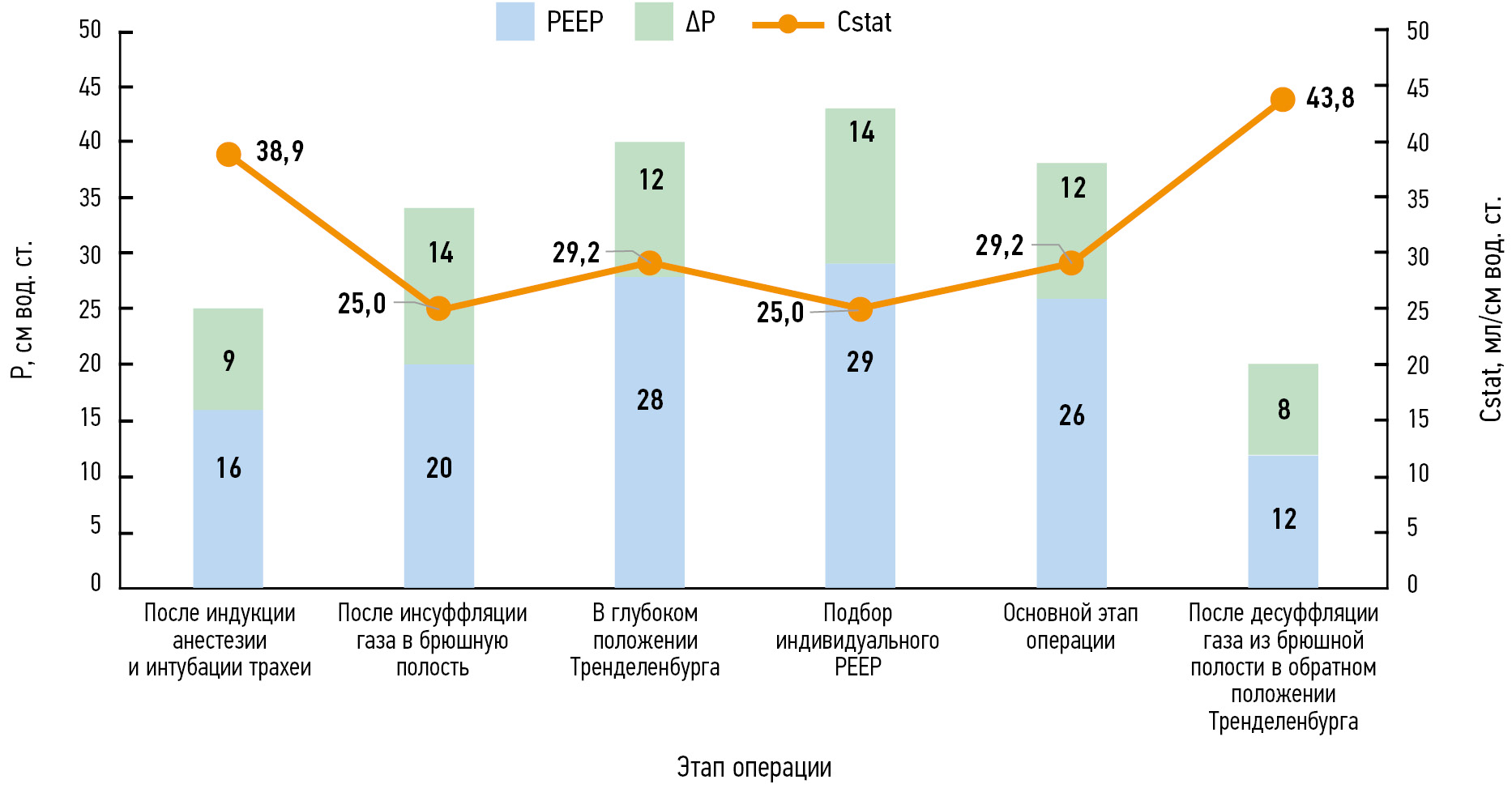 Значимое снижение статического комплаенса (Cstat) (с 38,9 до 19,7 мл/см вод. ст.) после создания карбоксиперитонеума и положения Тренделенбурга потребовало увеличения уровня PEEP. Индивидуализированный по движущему давлению (Driving Pressure, ΔP) уровень PEEP достигал 29 см вод. ст. (рис. 2).