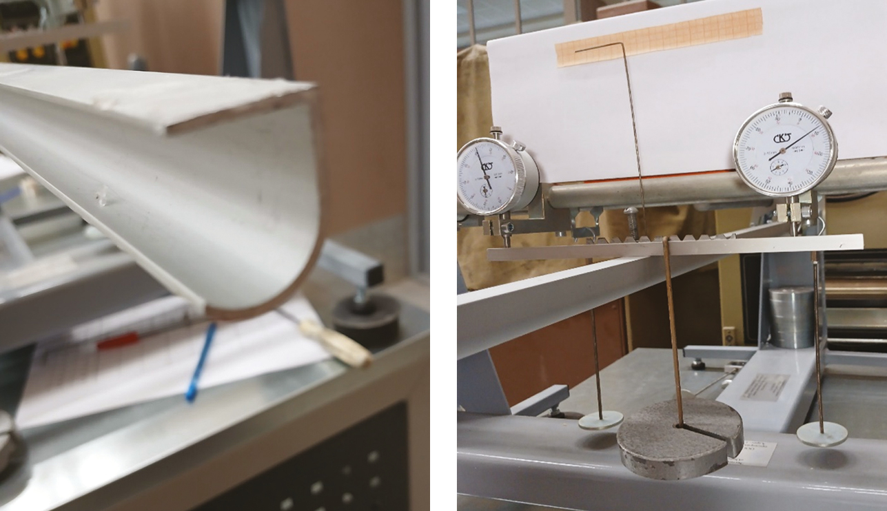 Для подтверждения теоретических предпосылок правильности расчета программы нами проведены экспериментальные исследования определения центра кручения открытого профиля. В качестве экспериментального профиля была выбрана балка с прямолинейно-криволинейным поперечным сечением, представленная на рис. 5. Размерные характеристики балки полностью соответствуют понятию балок с тонкостенным незамкнутым сечением, а именно использовались алюминиевые балки длиной 90 см и 50 см с толщиной стенки 2 мм с габаритами сечения 20 на 25 мм.