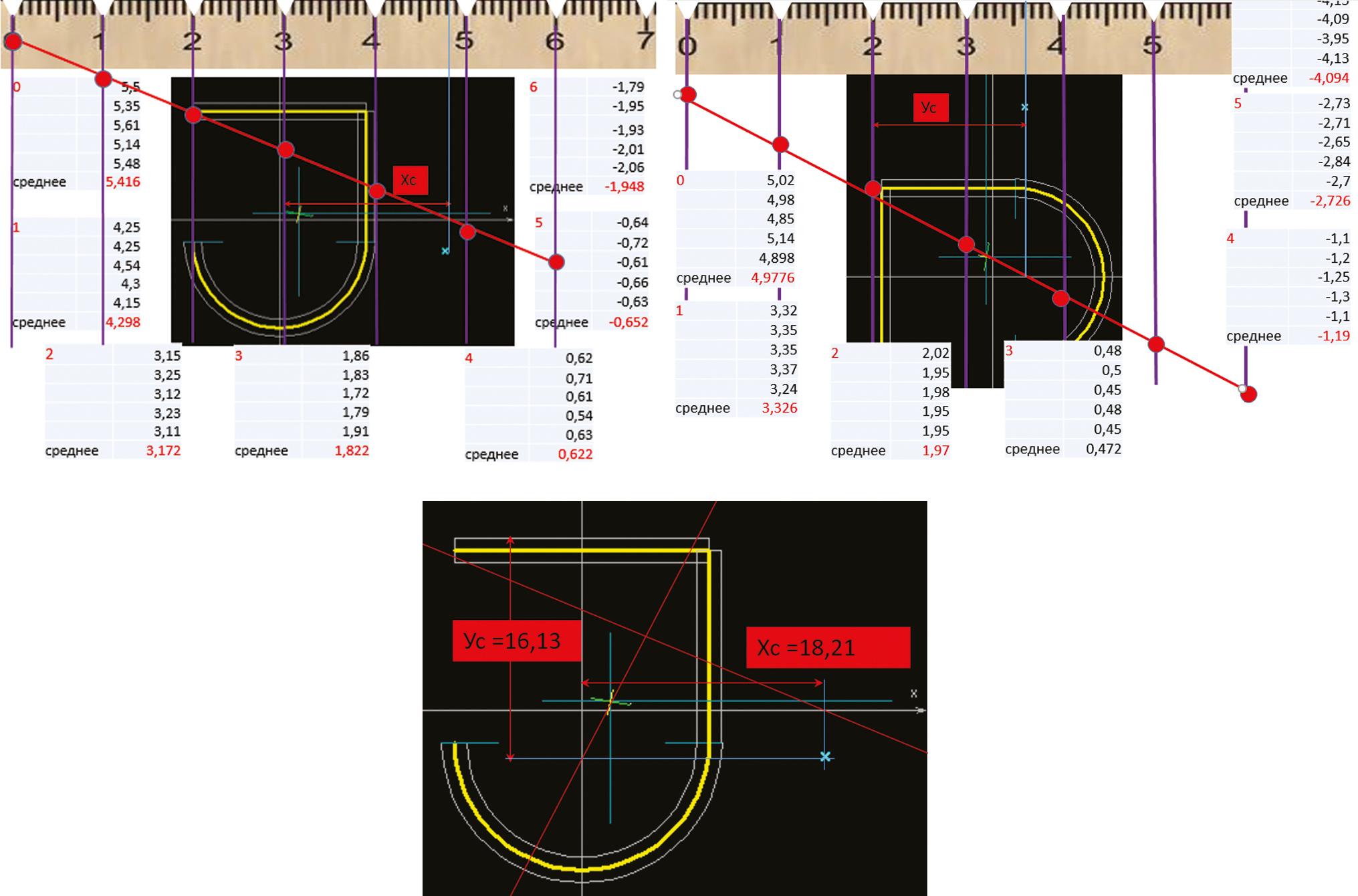 Следует обратить внимание на то, что расстояния до центра кручения аналитически и экспериментально определяются от разных точек начала отсчета: аналитически ― от срединной линии профиля, экспериментально ― слева от горизонтальной грани профиля.
