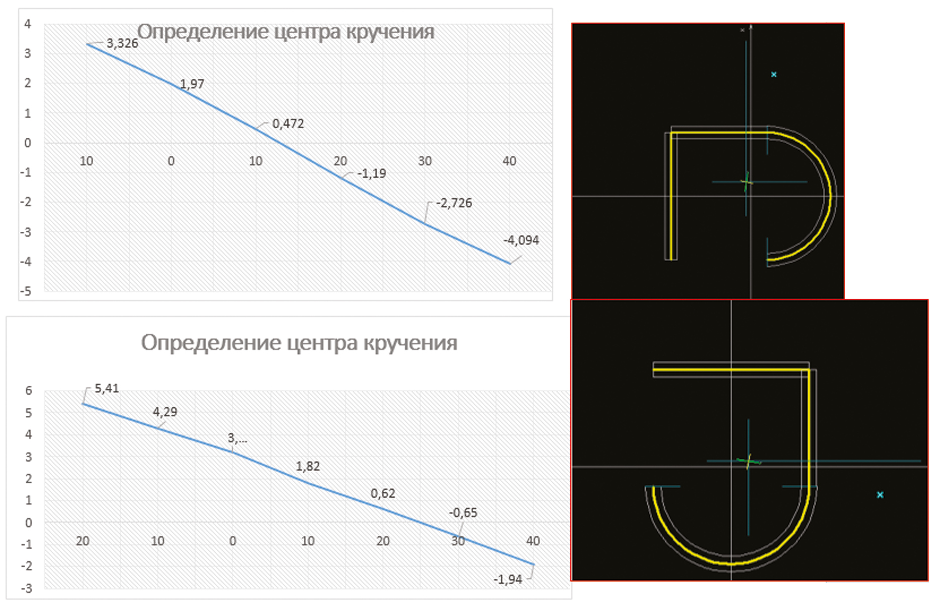 Рис. 7. Графическое определение центра кручения в разных плоскостях.