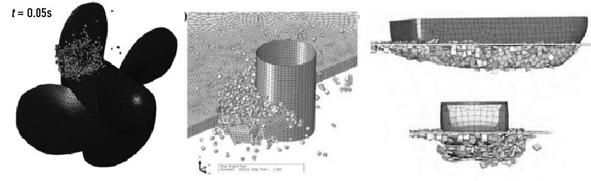 Рис. 3. Примеры использования МСЭ для численного моделирования взаимодействия льда с лопастями ГВ [6], опоры сооружения [8, 9], корпуса судна [7].