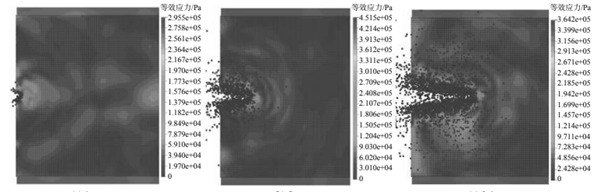 Рис. 5. Численное моделирования столкновения корпуса полярного судна с ледовым полем методом SPG (вид сверху). Распределение эквивалентных напряжений в ледовом блоке в различные моменты времени [22].