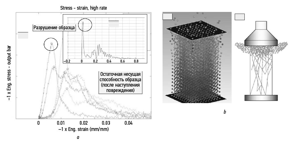 11. Рис. 10. Численное моделирование динамических испытаний на одноосное сжатие (v=1 м/с): a — кривые деформирования (зона хрупкого разрушения); b — характерная картина распространения повреждений, по материалам работ авторов [35, 36]. Метод SPG.