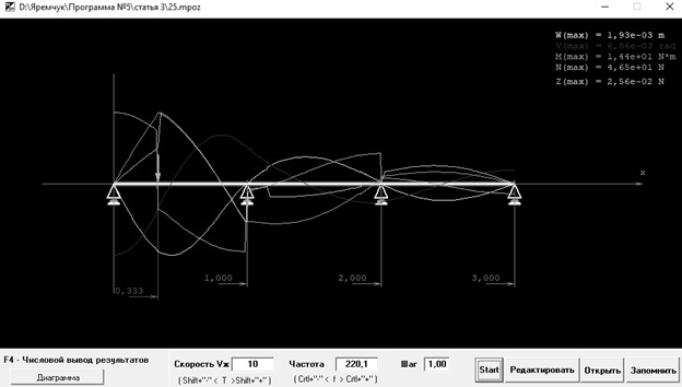 Расчёт проводился в программе «трубопровод-2», которая позволяет вычислять параметры вибрации в непризматическом прямолинейном многоопорном трубопроводе.
