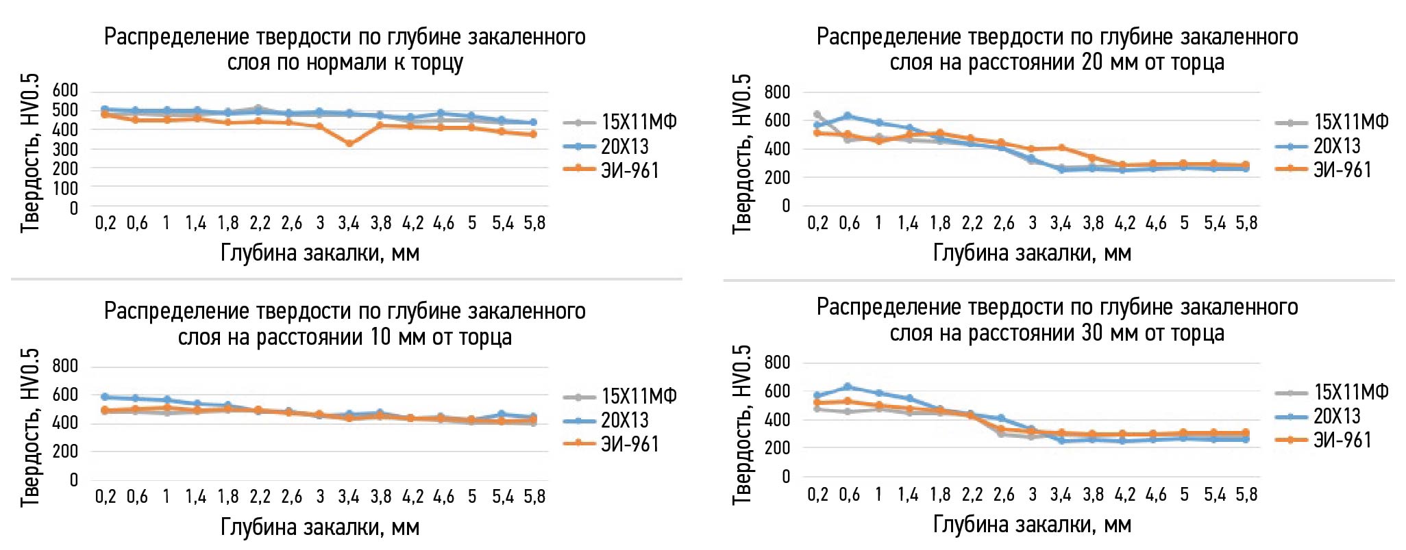 Глубина упрочненного слоя в области входной кромки составляет не менее 5 мм, а на примыкающем участке спинки лопатки — не менее 2 мм. Получена твердость в границах упрочненного слоя не менее 400 HV0.5.