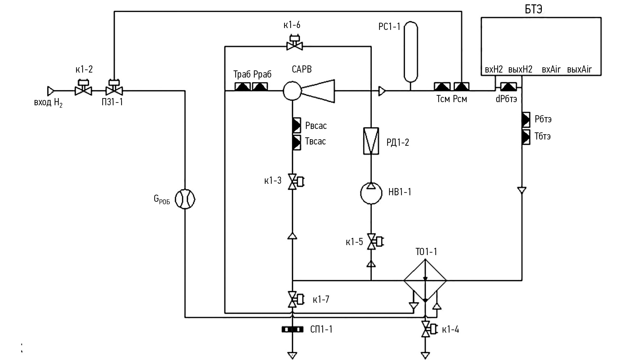 Рис. 3. Принципиальная пневмогидравлическая схема контура рециркуляции водорода батареи с твердополимерным электролитом.