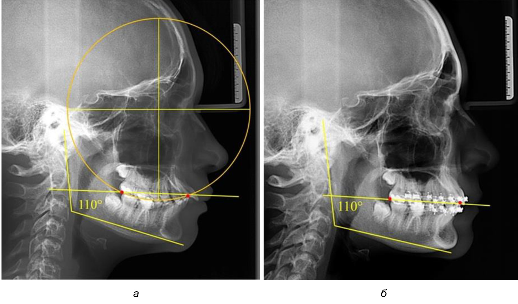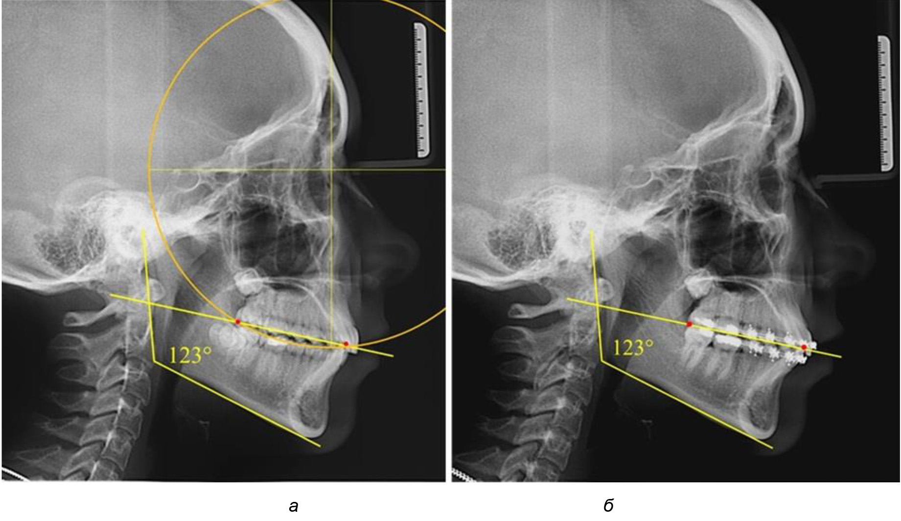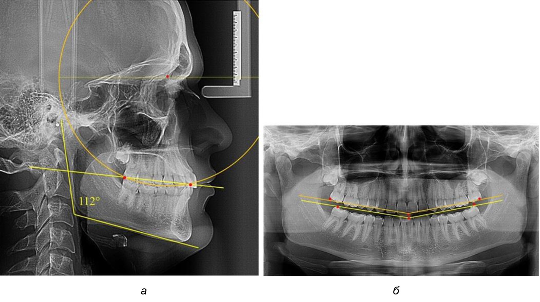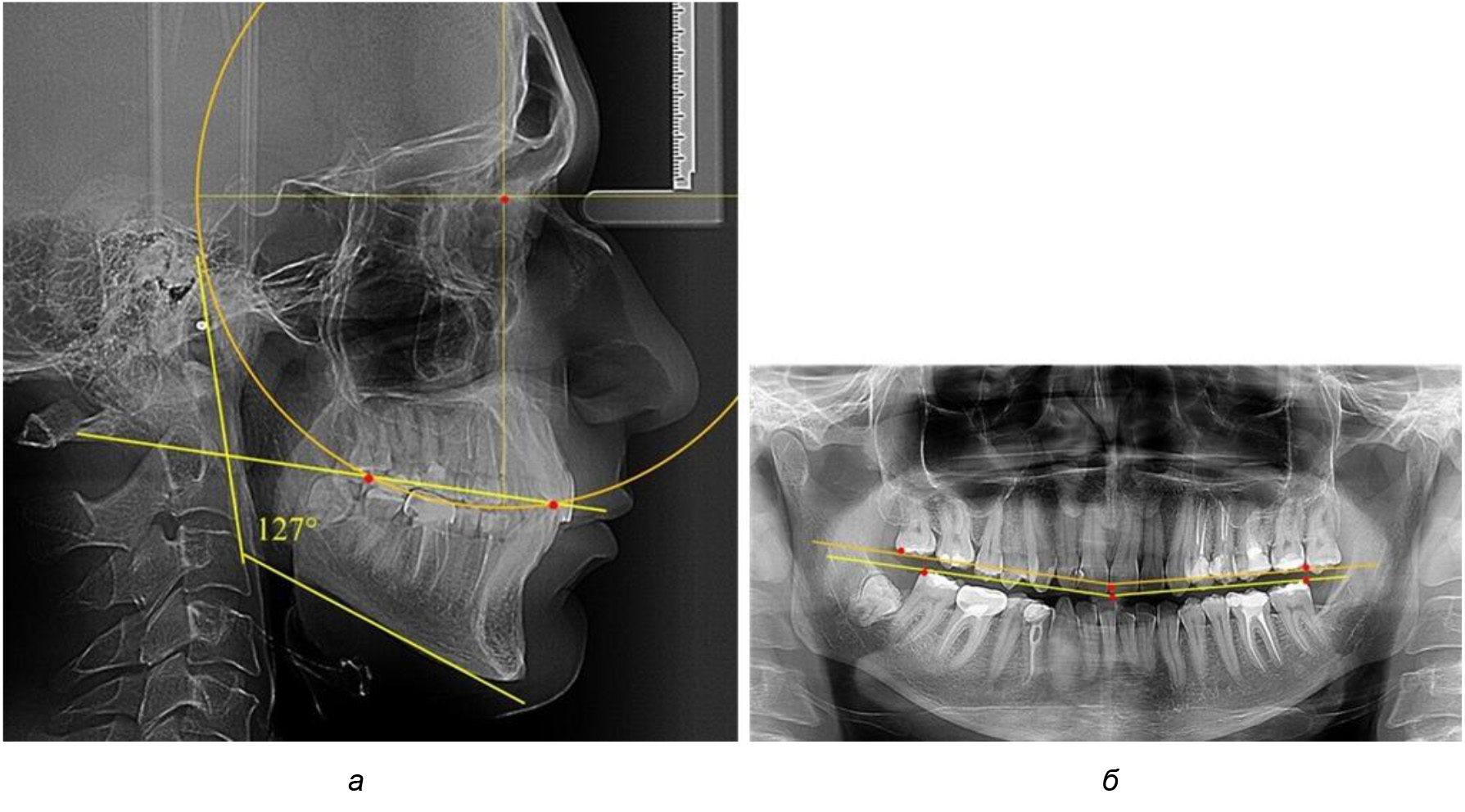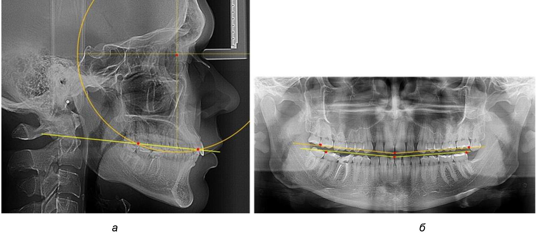 Рис. 6. Особенности ТРГ при оптимальной кривой Spee до лечения (а) и после лечения (б) техникой «прямой» дуги
