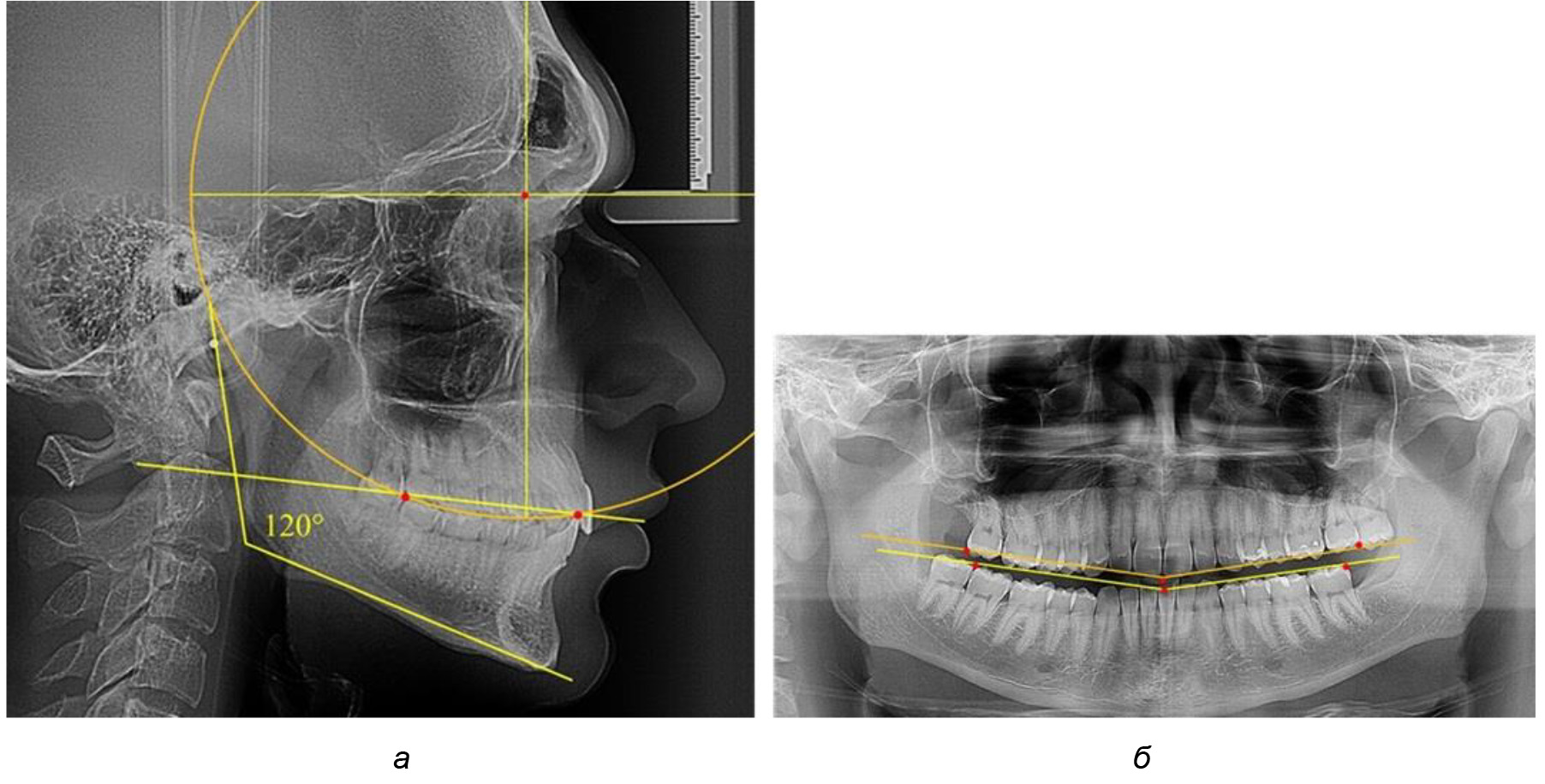 Рис. 4. Особенности кривой Spee на ТРГ (а) и ОПТГ (б) у людей с горизонтальным типом лица