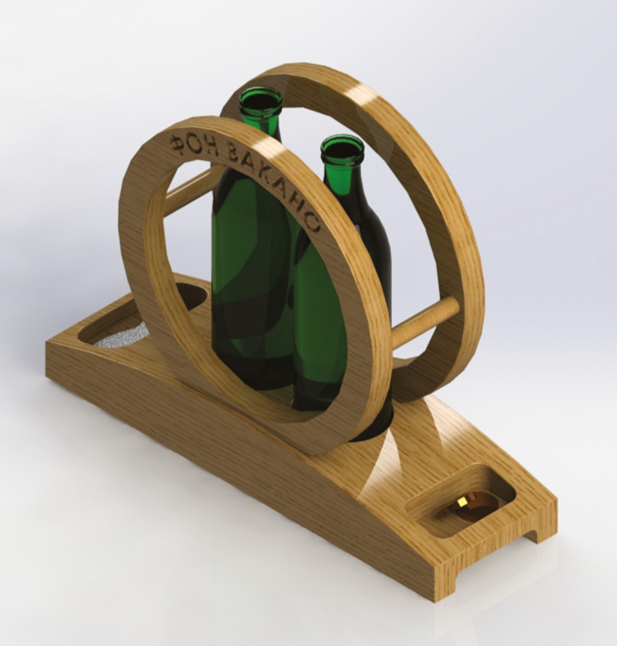 При разработке эскиза подставки важно учесть внешний вид логотипа, чтобы прослеживалась принадлежность к бренду. Органайзер рассчитан на две стеклянные бутылки объемом 0,5 л, также в основании имеется вырез под ключ-откупорку и отсек для крышек или других мелочей. Для обеспечения удобного переноса подставки по бокам сделаны отверстия для рук.