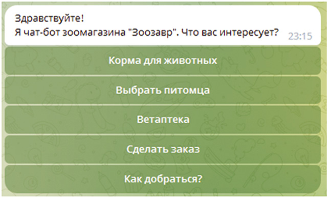 Выводы. Разработанный чат-бот обладает простым и понятным интерфейсом, а также предоставляет пользователю информационную поддержку по вопросам содержания домашних животных, что приводит к сокращению временных затрат на поиск необходимой информации. Кроме того, чат-бот работает круглосуточно в автоматическом режиме, что является одним из главных его достоинств.
