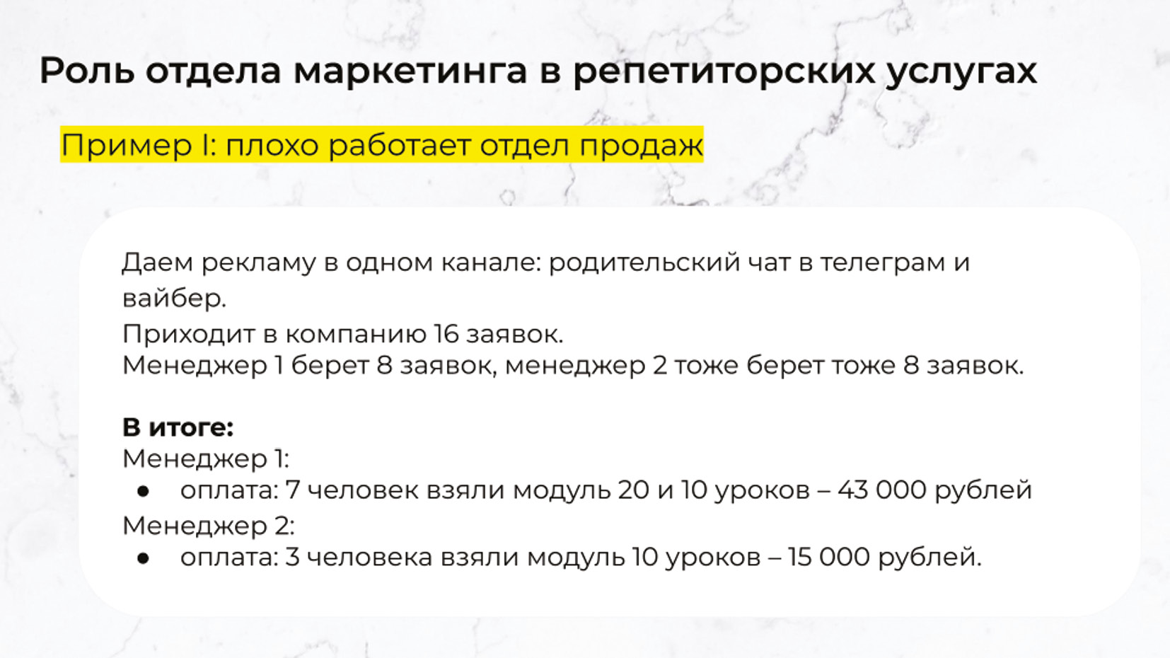Результаты. На основе анализа работы онлайн-школы «УМнаша» было выявлено, что наилучшими инструментами продвижения для репетиторских услуг являются: блогеры, чаты групп родителей в мессенджерах, платформы «profi.ru», «avito», робот массового действия, внутренний маркетинг (проработка программы лояльности для действующих клиентов). Данные инструменты помогают привлекать учеников при малых затратах на рекламу (оплата самих площадок размещения рекламы). После определения наиболее эффективных инструментов необходимо было выяснить, какую роль играет отдел маркетинга при продвижении репетиторских услуг. Для этого мы рассмотрели «путь клиента», где была проанализирована работа отделов: продаж, педагогов, маркетинга. Мы оценивали работу отдела менеджеров по продажам (рис. 1) и отдела педагогов (рис. 2). Таким образом, мы сделали вывод, что маркетинг не влияет на стоимость рекламы в полной мере. Стоимость рекламы зависит от всех подразделений компании, потому что клиент проходит целый путь, который затрагивает несколько отделов: продаж, педагогов, маркетинга. Маркетинг более всего влияет на такой показатель, как привлечение клиентов в компанию.